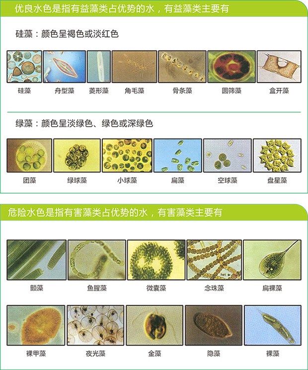 水色主要是由水体中浮游生物及底栖生物的种类决定的,根据对水产养殖影响好坏程度分为优良水色和危险水色。