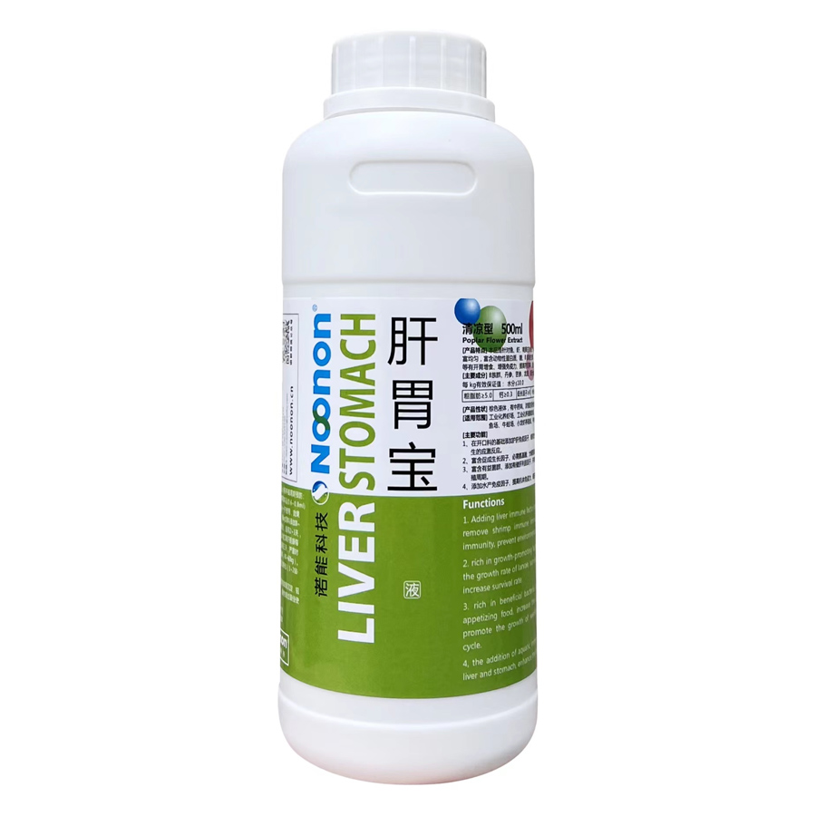 4、添加水产免疫因子、提高机体免疫力、保肝健胃、增强机体对病菌、病毒的抵抗力。【用法用量】1.建议从放苗期开始使用。2.工厂化及小棚养殖周期预防:拌料∶每kg饲料添加(3~4ml);泼撒∶每立方水体用本品(0.6~0.8ml)建议和本公司抗病毒对虾多维每立方水体(0.5~0.8g)一齐使用,效果更佳;3.转肝期使用(放苗后15~20日);拌料∶每kg饲料添加8~~10ml;可加量使用︰配合转肝灵一齐使用,效果更佳;连用2~3天,每天2次。泼撒︰每立方水体用( 1~2 ml)和本公司红黄肝胆康每立方水体用( 1~2ml )一齐使用,连用2~3天,连用三天;严重时应适当加大用量。4.高位池及土池﹔拌料∶每瓶本品拌(40~60kg )。泼撒︰每瓶本品用(2~3亩·米水深);可配合转肝灵每包( 1~2亩·米水深)一齐使用,病情严重时可加倍使用。